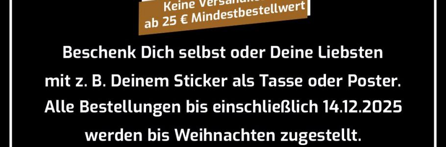 Noch auf der Suche nach passenden Geschenken? Wie wäre es zum Beispiel mit dem eigenen Stickerbild auf einer Tasse oder als Poster? stickerfive bietet jetzt den gesamten Dezember kostenlosen Versand auf alle Bestellungen ab 25 Euro Warenwert. Bestellungen die bis zum 14.12. eingehen, werden auch noch rechtzeitig zu Weihnachten zugestellt. Schaut einfach mal rein unter: https://vfb-kirchhellen.stickerfive.de/