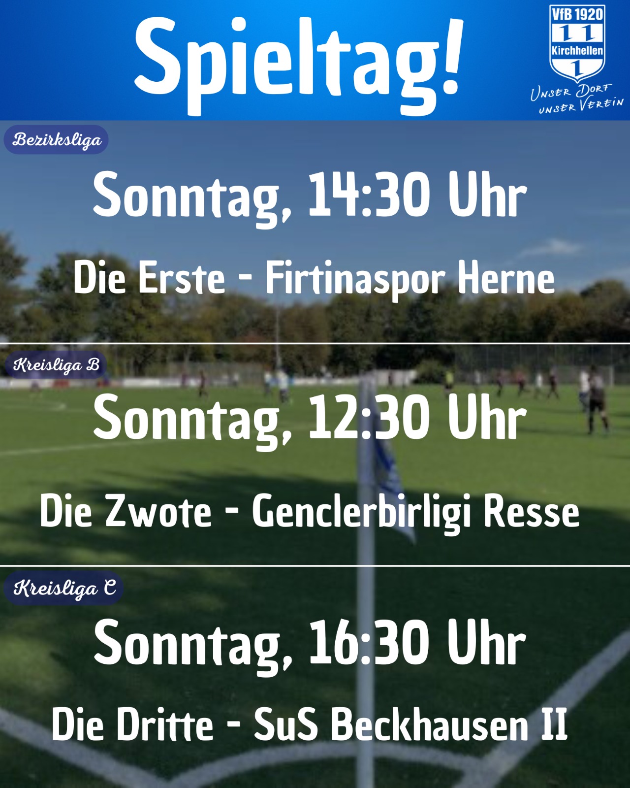 Am Sonntag kommt es an der Lionsfieldroad zum Supersonntag! Alle drei Seniorenteams spielen auf der heimischen Anlage ihre Heimspiel aus. Den Anfang macht duie Zweite um 12.30 Uhr gegen Genc. Resse. Darauf folgt die Erste mit ihrem Spiel gegen Firtinaspor Herne. Um 16.30 Uhr empfängt die Dritte dann Beckhausen II. Fußballfanatiker können um 09.20 Uhr schon die B-Jugend und um 10.45 die A2 verfolgen! Super-Sonntag!