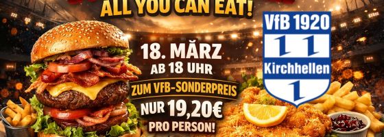 Zum 2. Mal bieten wir unseren VfB Mitgliedern & deren Freunden/Familien ein unglaubliches VfB Spezial an! Im Moment Tree gibt es wieder Schnitzel & Burger ALL YOU CAN EAT statt 26,90€ zum VfB Gründungspreis 19,20€ (!) pro Person exklusive Getränke an! Verbindliche Anmeldungen direkt an mich (Marco Samland): oeffentlichkeitsarbeit@vfbkirchhellen.de