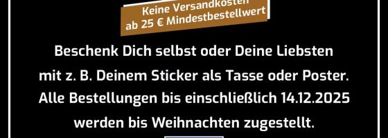 Noch auf der Suche nach passenden Geschenken? Wie wäre es zum Beispiel mit dem eigenen Stickerbild auf einer Tasse oder als Poster? stickerfive bietet jetzt den gesamten Dezember kostenlosen Versand auf alle Bestellungen ab 25 Euro Warenwert. Bestellungen die bis zum 14.12. eingehen, werden auch noch rechtzeitig zu Weihnachten zugestellt. Schaut einfach mal rein unter: https://vfb-kirchhellen.stickerfive.de/